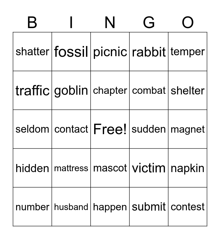 This bingo card has a free space and 24 words: mattress, husband, chapter, number, temper, shatter, traffic, fossil, sudden, mascot, combat, seldom, victim, napkin, goblin, submit, magnet, picnic, shelter, contact, contest, hidden, rabbit and happen.