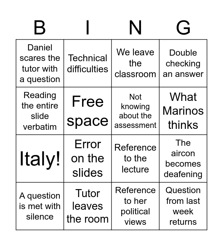This bingo card has 16 words: Tutor leaves the room, The aircon becomes deafening, We leave the classroom, Daniel scares the tutor with a question, Italy!, Technical difficulties, Reference to the lecture, Reference to her political views, Reading the entire slide verbatim, Free space, A question is met with silence, Double checking an answer, Error on the slides, What Marinos thinks, Not knowing about the assessment and Question from last week returns.