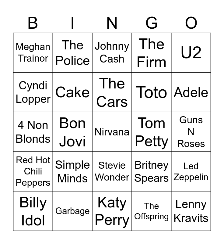 This bingo card has 1 images and 62 words: Grateful Dead, Bob Dylan, Led Zeppelin, The Doors, AC/DC, The Police, Otis Redding, The Cars, King Harvest, Stevie Wonder, Hall & Oats, Guns N Roses, U2, Culture Club, Cyndi Lopper, Bon Jovi, Meghan Trainor, Black Sabbath, Toto, Simple Minds, Red Hot Chili Peppers, The Firm, Nine Inch Nails, Michael Jackson, Queen, Steve Miller Band, The Guess Who, Beatles, Fleetwood Mac, DJ Jazzy Jeff & The Fresh Prince, Marcy's Playground, Elton John, Metallica, Adele, Billy Idol, Sublime, The Offspring, Beastie Boys, Cake, 4 Non Blonds, Tom Petty, Smashing Pumpkins, Green Day, Nirvana, Garbage, Lenny Kravits, Britney Spears, Dee-Lite, Rage Against the Machine, Oasis, Katy Perry, Beck, Robert Palmer, Fionna Apple, Johnny Cash, Bob Marley, Aerosmith, Lynyrd Skynyrd, The Rolling Stones, Creedence Clear Water Revival, David Bowie and Dolly Parton.