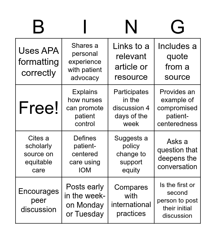 This bingo card has 16 words: Posts early in the week-on Monday or Tuesday, Asks a question that deepens the conversation, Links to a relevant article or resource, Uses APA formatting correctly, Cites a scholarly source on equitable care, Shares a personal experience with patient advocacy, Suggests a policy change to support equity, Compares with international practices, Free!, Explains how nurses can promote patient control, Encourages peer discussion, Includes a quote from a source, Defines patient-centered care using IOM, Provides an example of compromised patient-centeredness, Participates in the discussion 4 days of the week and Is the first or second person to post their initial discussion.