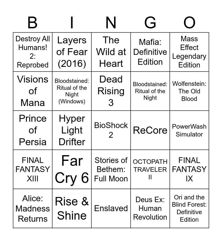 This bingo card has 25 words: Far Cry 6, Enslaved, Dead Rising 3, Alice: Madness Returns, Mass Effect Legendary Edition, Destroy All Humans! 2: Reprobed, Visions of Mana, Layers of Fear (2016), ReCore, Stories of Bethem: Full Moon, Bloodstained: Ritual of the Night, Prince of Persia, OCTOPATH TRAVELER II, FINAL FANTASY IX, Bloodstained: Ritual of the Night (Windows), Ori and the Blind Forest: Definitive Edition, PowerWash Simulator, The Wild at Heart, Wolfenstein: The Old Blood, Hyper Light Drifter, BioShock 2, Rise & Shine, FINAL FANTASY XIII, Mafia: Definitive Edition and Deus Ex: Human Revolution.