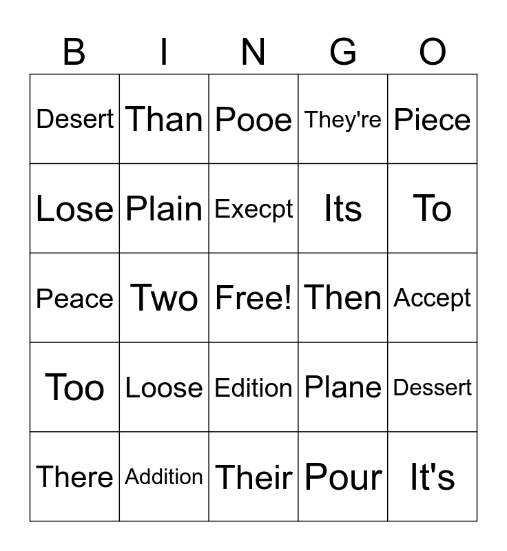 This bingo card has a free space and 24 words: There, Loose, Execpt, Pour, Piece, Desert, Than, Pooe, Then, Accept, Peace, Plain, Plane, Dessert, Lose, Addition, Their, They're, To, Too, Two, Edition, Its and It's.