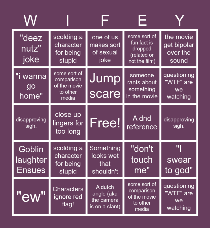 This bingo card has a free space and 75 words: "ew", "deez nutz" joke, one of us makes sort of sexual joke, when someone calls out a theory correctly, Jumpscare, "i wanna go home", Something looks wet that shouldn't, close up lingers for too long, "don't touch me", "ew", "deez nutz" joke, one of us makes sort of sexual joke, Jump scare, "i wanna go home", Something looks wet that shouldn't, close up lingers for too long, "don't touch me", questioning "WTF" are we watching, someone rants about something in the movie, the movie get bipolar over the sound, someone gives a theory, disapproving sigh., some sort of comparison of the movie to other media, scolding a character for being stupid, some sort of fun fact is dropped (related or not the film), one of us has physical reaction, "ew", "deez nutz" joke, one of us makes sort of sexual joke, Jump scare, "i wanna go home", Something looks wet that shouldn't, close up lingers for too long, "don't touch me", questioning "WTF" are we watching, someone rants about something in the movie, the movie get bipolar over the sound, someone gives a theory, disapproving sigh., some sort of comparison of the movie to other media, scolding a character for being stupid, some sort of fun fact is dropped (related or not the film), one of us has physical reaction, one of makes a joke to cope, one of us says an inside thought loud, A dnd refeence, "ew", "deez nutz" joke, one of us makes sort of sexual joke, Jump scare, "i wanna go home", Something looks wet that shouldn't, close up lingers for too long, "don't touch me", questioning "WTF" are we watching, someone rants about something in the movie, the movie get bipolar over the sound, someone gives a theory, disapproving sigh., some sort of comparison of the movie to other media, scolding a character for being stupid, some sort of fun fact is dropped (related or not the film), one of us has physical reaction, one of makes a joke to cope, one of us says an inside thought loud, A dnd reference, Mocking something in the movie, "why are you like this?", "maaaaaaybeeee", "I swear to god", Goblin laughter Ensues, Characters ignore red flag!, one of us make a dumb joke., A dutch angle (aka the camera is on a slant) and Movie is too dark..
