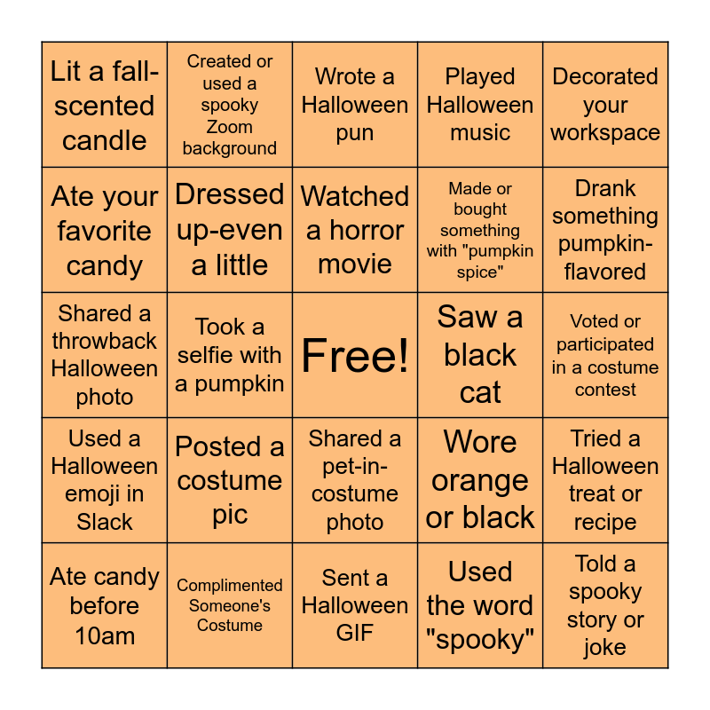 This bingo card has a free space and 24 words: Posted a costume pic, Complimented Someone's Costume, Watched a horror movie, Ate candy before 10am, Decorated your workspace, Lit a fall-scented candle, Ate your favorite candy, Created or used a spooky Zoom background, Saw a black cat, Shared a pet-in-costume photo, Made or bought something with "pumpkin spice", Shared a throwback Halloween photo, Wore orange or black, Tried a Halloween treat or recipe, Dressed up-even a little, Used the word "spooky", Voted or participated in a costume contest, Wrote a Halloween pun, Drank something pumpkin-flavored, Took a selfie with a pumpkin, Told a spooky story or joke, Used a Halloween emoji in Slack, Played Halloween music and Sent a Halloween GIF.