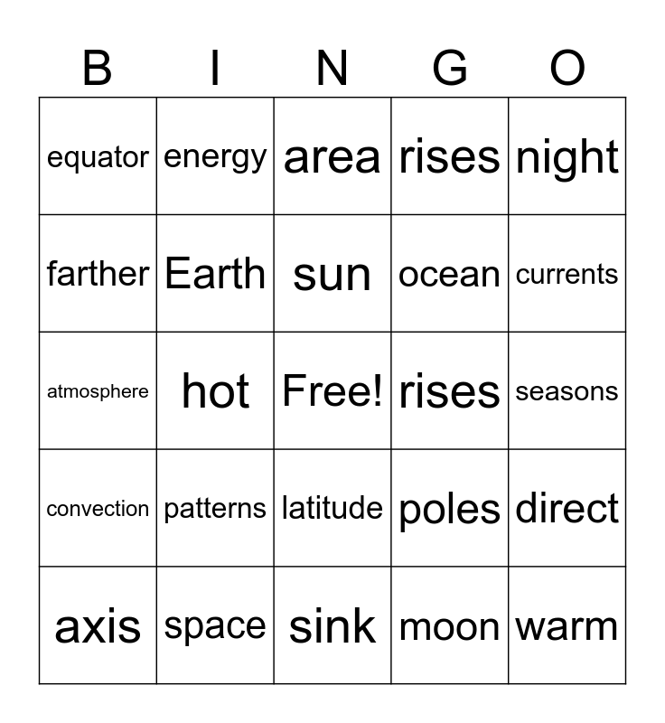 This bingo card has a free space and 24 words: patterns, space, sun, axis, night, equator, farther, energy, rises, latitude, ocean, atmosphere, poles, direct, Earth, moon, seasons, area, currents, hot, warm, convection, rises and sink.
