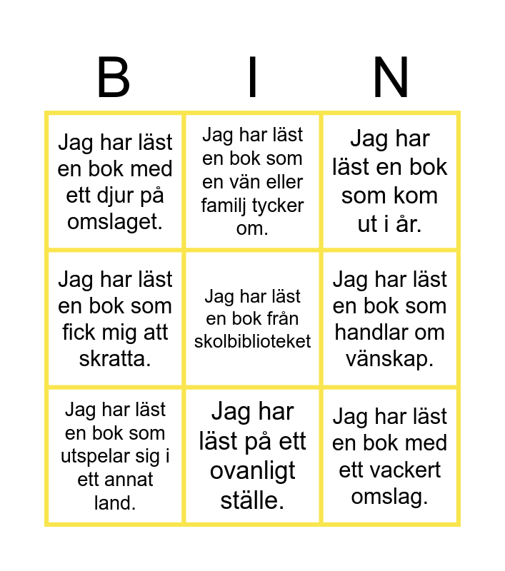 This bingo card has 18 words: Jag har läst en ny genre, Jag har läst en bok som blivit film, Jag har läst en bok som kom ut i år., Jag har läst en bok med ett djur på omslaget., Jag har läst ut en bok, Jag har läst en bok som fick mig att skratta., Jag har läst en dikt eller en novell., Jag har läst en bok som en vän eller familj tycker om., Jag har läst på ett ovanligt ställe., Jag har läst en bok med ett vackert omslag., Jag har läst en bok med en titel jag gillar., Jag har läst en bok från skolbiblioteket, Jag har läst en bok av en kvinnlig författare., Jag har läst en bok som handlar om vänskap., Jag har läst en bok som utspelar sig i ett annat land., Jag har läst en bok som fick mig att gråta., Jag har läst en bok med en kort (en eller två ord) titel. and Jag har läst en bok som kom ut innan år 2000..