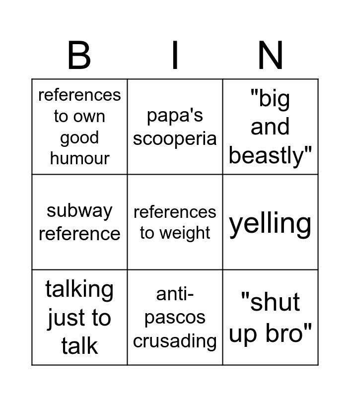 This bingo card has a free space and 8 words: yelling, "big and beastly", papa's scooperia, talking just to talk, references to own good humour, "shut up bro", subway reference and anti-pascos crusading.