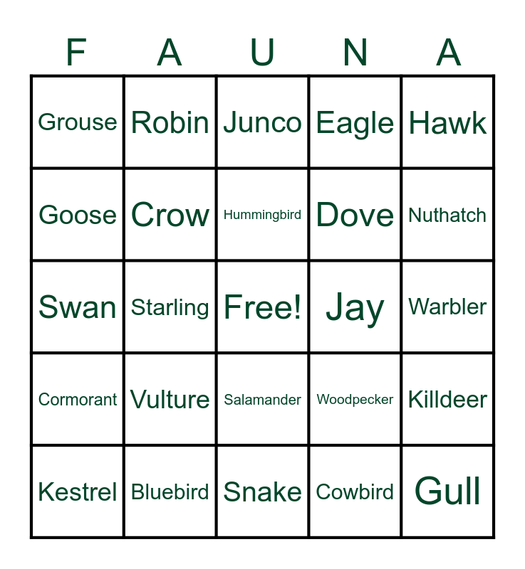 This bingo card has a free space and 61 words: Blackbird, Bluebird, Chickadee, Cormorant, Cowbird, Creeper, Crow, Dipper, Dove, Duck, Eagle, Finch, Goose, Grosbeak, Grouse, Grouse, Gull, Hawk, Heron, Hummingbird, Jay, Junco, Kestrel, Killdeer, Kingfisher, Kinglet, Loon, Merganser, Nuthatch, Owl, Pelican, Pigeon, Quail, Raven, Robin, Sandpiper, Sparrow, Starling, Swallow, Swan, Thrush, Vulture, Warbler, Waxwing, Woodpecker, Wren, Frog, Lizzard, Newt, Salamander, Snake, Toad, Turtle, Bat, Beaver, Mink, Mouse, Otter, Rabbit, Raccoon and Squirrel.