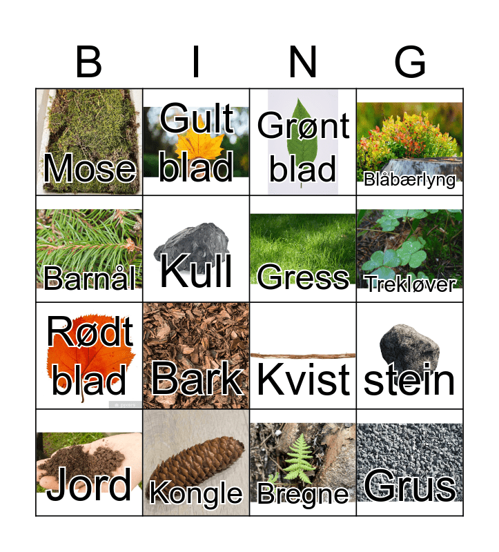 This bingo card has 16 images and 16 words: Kongle, stein, Grønt blad, Mose, Rødt blad, Gult blad, Kvist, Bregne, Barnål, Kull, Jord, Blåbærlyng, Bark, Trekløver, Gress and Grus.