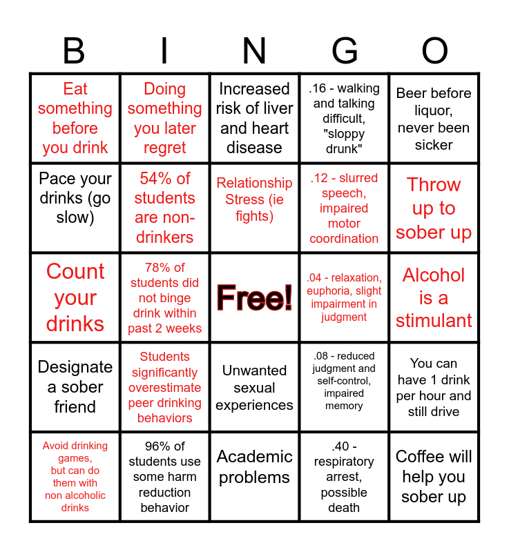This bingo card has a free space and 34 words: Alternate alcoholic and non-alcoholic drinks, 2.2: Average number of drinks while "partying", Hangover (dizziness, nausea, headache), .30 - alcohol poisoning, loss of consciousness, Alcohol is a stimulant, Pace your drinks (go slow), 54% of students are non-drinkers, Academic problems, .12 - slurred speech, impaired motor coordination, Coffee will help you sober up, Count your drinks, Doing something you later regret, .40 - respiratory arrest, possible death, Beer doesn't have as much alcohol as liquor, Designate a sober friend, 78% of students did not binge drink within past 2 weeks, Unwanted sexual experiences, .04 - relaxation, euphoria, slight impairment in judgment, You can have 1 drink per hour and still drive, Avoid drinking games, but can do them with non alcoholic drinks, 96% of students use some harm reduction behavior, It costs money …, .16 - walking and talking difficult, "sloppy drunk", Throw up to sober up, Set your intentions before you drink, Students significantly overestimate peer drinking behaviors, Increased risk of liver and heart disease, .20 - total confusion, nausea and vomiting, Beer before liquor, never been sicker, Eat something before you drink, Berea students drink less than the national average, Relationship Stress (ie fights), .08 - reduced judgment and self-control, impaired memory and Liquor before beer, you're in the clear.