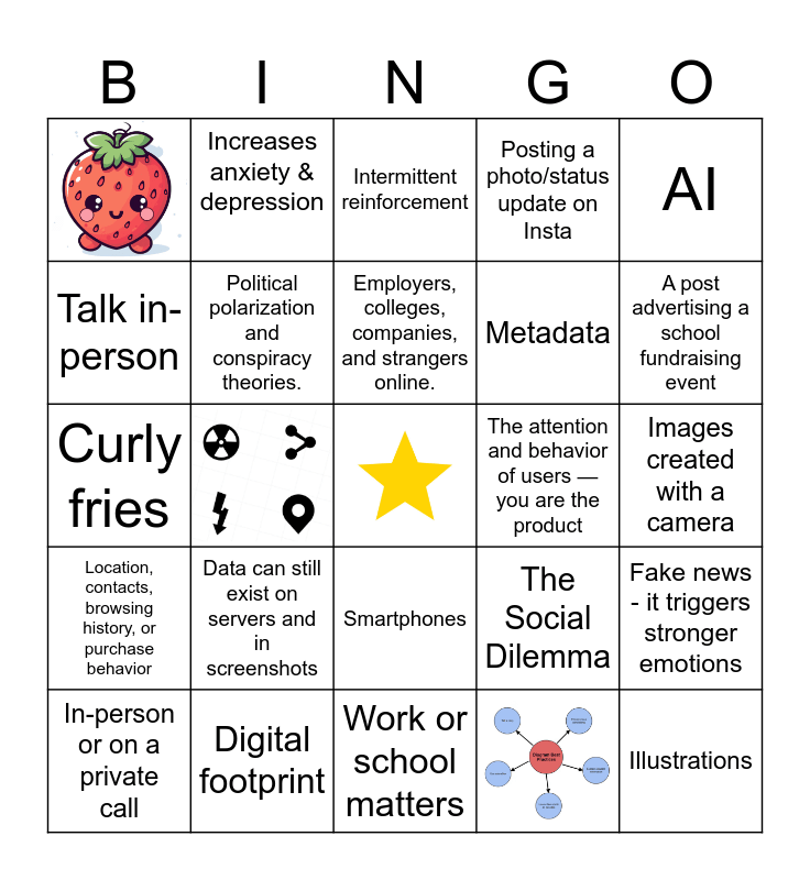 This bingo card has 3 images, a free space and 24 words: The Social Dilemma, Turn off notifications, Metadata, Work or school matters, Talk in-person, Intermittent reinforcement, Increases anxiety & depression, Location, contacts, browsing history, or purchase behavior, The attention and behavior of users — you are the product, Fake news - it triggers stronger emotions, Curly fries, Posting a photo/status update on Insta, In-person or on a private call, Digital footprint, A post advertising a school fundraising event, Damage reputations and spread drama publicly, Political polarization and conspiracy theories., Employers, colleges, companies, and strangers online., Data can still exist on servers and in screenshots, Images created with a camera, Illustrations, Smartphones, AI and Google search.