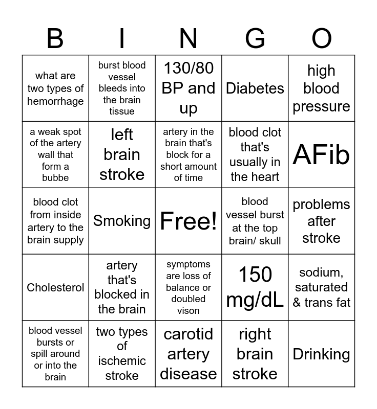 This bingo card has a free space and 24 words: artery that's blocked in the brain, two types of ischemic stroke, artery in the brain that's block for a short amount of time, blood vessel bursts or spill around or into the brain, high blood pressure, what are two types of hemorrhage, a weak spot of the artery wall that form a bubbe, burst blood vessel bleeds into the brain tissue, blood vessel burst at the top brain/ skull, symptoms are loss of balance or doubled vison, blood clot that's usually in the heart, blood clot from inside artery to the brain supply, 150 mg/dL, sodium, saturated & trans fat, left brain stroke, right brain stroke, problems after stroke, 130/80 BP and up, AFib, Smoking, Drinking, Cholesterol, Diabetes and carotid artery disease.