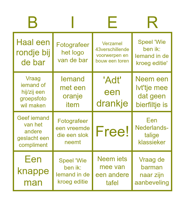 This bingo card has 19 words: Free!, Bots 'per ongeluk' tegen iemand aan, Verzamel 43verschillende voorwerpen en bouw een toren, Vraag de barman naar zijn aanbeveling, Een Nederlands- talige klassieker, Vraag iemand of hij/zij een groepsfoto wil maken, Neem iets mee van een andere tafel, Haal een rondje bij de bar, Fotografeer het logo van de bar, Geef iemand van het andere geslacht een compliment, Fotografeer een vreemde die een slok neemt, Iemand met een oranje item, 'Adt' een drankje, Speel 'Wie ben ik: Iemand in de kroeg editie, Een knappe man, Neem een bierviltje mee (naar een andere kroeg), Speel 'Wie ben ik: Iemand in de kroeg editie', Neem een lvt'tje mee dat geen bierfiltje is and Maak een toost met en op de barman.