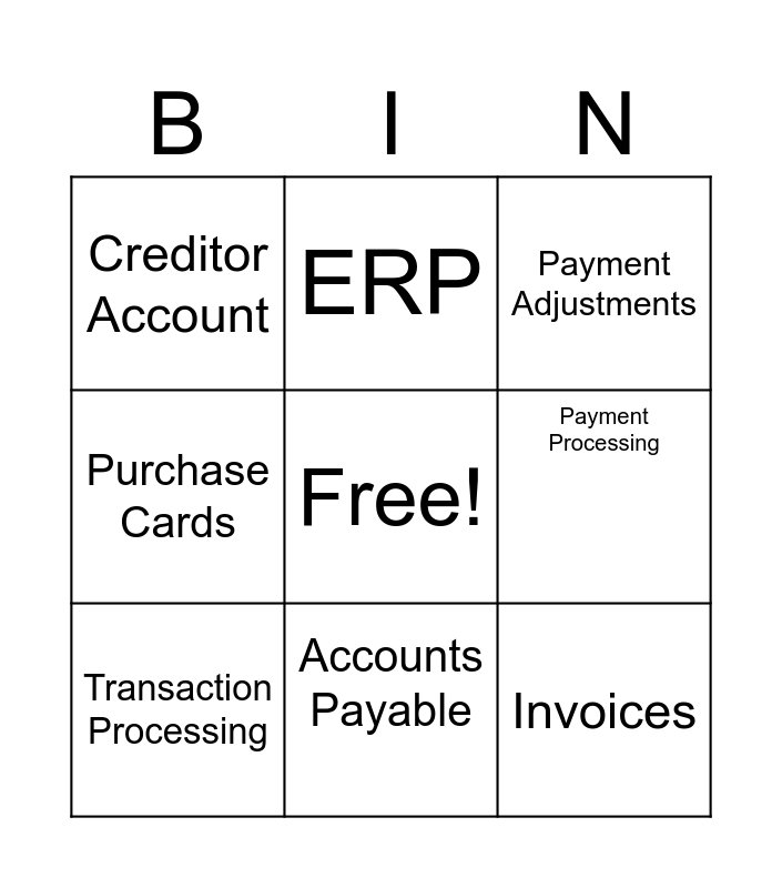 This bingo card has a free space and 8 words: Payment Processing, Payment Adjustments, ERP, Transaction Processing, Creditor Account, Invoices, Purchase Cards and Accounts Payable.