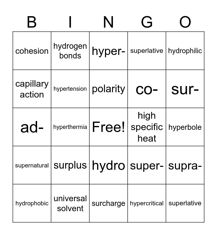 This bingo card has a free space and 24 words: surplus, universal solvent, polarity, hydrophobic, hydrophilic, cohesion, capillary action, hydrogen bonds, high specific heat, hydro, co-, ad-, super-, supra-, hypertension, hypercritical, hyperbole, hyper-, sur-, hyperthermia, superlative, supernatural, superlative and surcharge.