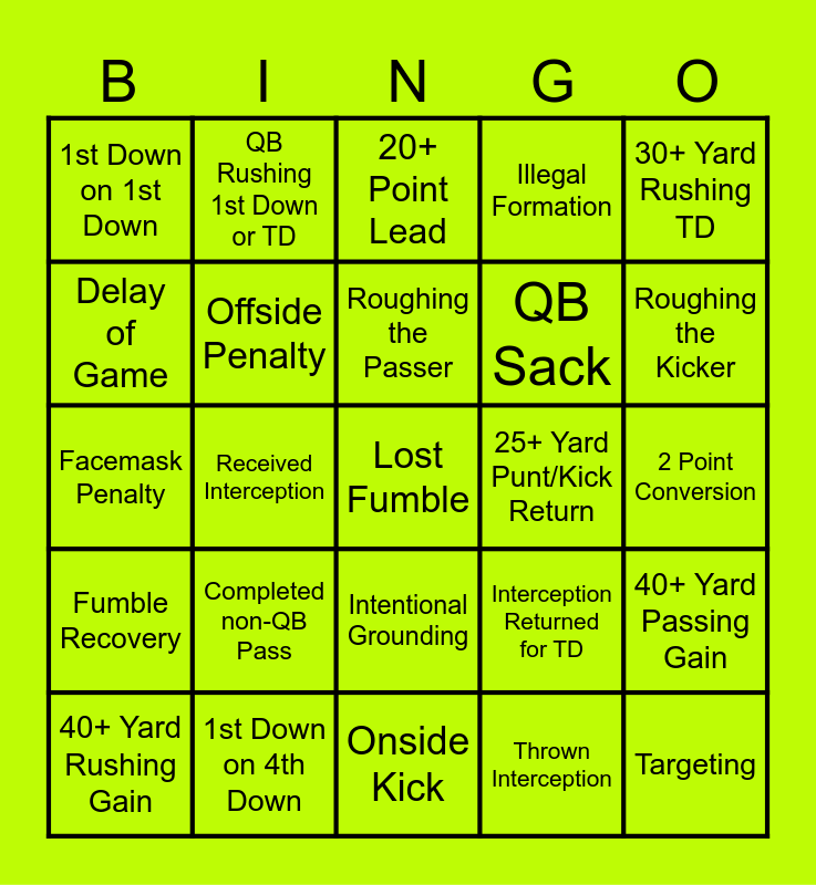 This bingo card has 35 words: Pass Interference, Holding Penalty, False Start Penalty, Offside Penalty, Intentional Grounding, Illegal Formation, Delay of Game, Other Personal Foul, Roughing the Passer, Illegal Block Penalty, Facemask Penalty, 30+ Yard Rushing TD, 40+ Yard Field Goal, 30+ Yard Passing TD, 1st Down on 1st Down, 25+ Yard Punt/Kick Return, Thrown Interception, Received Interception, Fumble Recovery, Lost Fumble, Interception Returned for TD, 40+ Yard Rushing Gain, 40+ Yard Passing Gain, 1st Down on 4th Down, 20+ Point Lead, Roughing the Kicker, Targeting, Player Ejection, QB Sack, 2 Point Conversion, Fake Punt/Kick, Onside Kick, Completed non-QB Pass, QB Rushing 1st Down or TD and Referee On-Field Call Reversed.