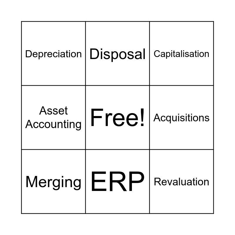 This bingo card has a free space and 8 words: Acquisitions, Capitalisation, Disposal, Merging, Depreciation, Revaluation, Asset Accounting and ERP.