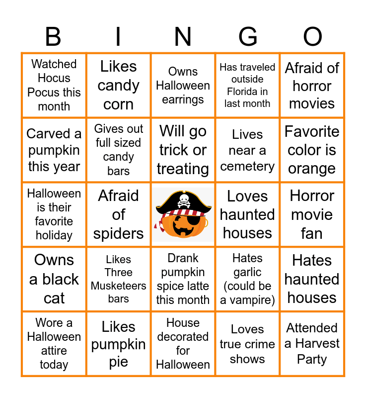 This bingo card has a free space and 24 words: Likes Three Musketeers bars, Likes pumpkin pie, Will go trick or treating, Wore a Halloween attire today, Afraid of horror movies, Watched Hocus Pocus this month, Carved a pumpkin this year, Likes candy corn, Loves haunted houses, Drank pumpkin spice latte this month, Lives near a cemetery, Halloween is their favorite holiday, Hates garlic (could be a vampire), Hates haunted houses, Gives out full sized candy bars, Loves true crime shows, Horror movie fan, Owns Halloween earrings, Favorite color is orange, Afraid of spiders, Attended a Harvest Party, Owns a black cat, Has traveled outside Florida in last month and House decorated for Halloween.