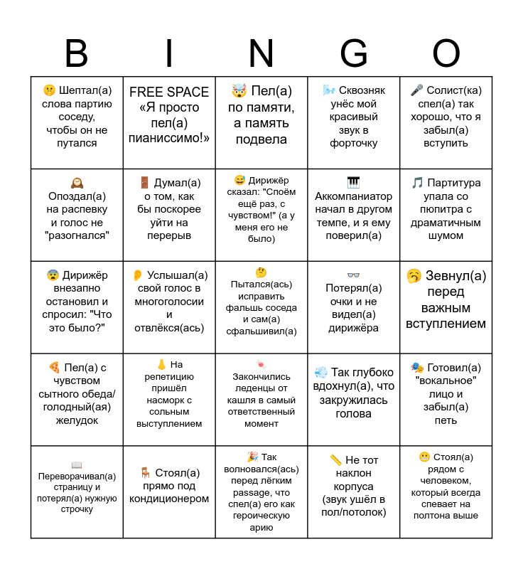 This bingo card has a free space and 24 words: 👃 На репетицию пришёл насморк с сольным выступлением, 🪑 Стоял(а) прямо под кондиционером, 😅 Дирижёр сказал: "Споём ещё раз, с чувством!" (а у меня его не было), 📖 Переворачивал(а) страницу и потерял(а) нужную строчку, 🎤 Солист(ка) спел(а) так хорошо, что я забыл(а) вступить, 🤫 Шептал(а) слова партию соседу, чтобы он не путался, 🕰️ Опоздал(а) на распевку и голос не "разогнался", FREE SPACE «Я просто пел(а) пианиссимо!», 👓 Потерял(а) очки и не видел(а) дирижёра, 🍬 Закончились леденцы от кашля в самый ответственный момент, 🎹 Аккомпаниатор начал в другом темпе, и я ему поверил(а), 😨 Дирижёр внезапно остановил и спросил: "Что это было?", 💨 Так глубоко вдохнул(а), что закружилась голова, 🎭 Готовил(а) "вокальное" лицо и забыл(а) петь, 🚪 Думал(а) о том, как бы поскорее уйти на перерыв, 📏 Не тот наклон корпуса (звук ушёл в пол/потолок), 🥱 Зевнул(а) перед важным вступлением, 🤯 Пел(а) по памяти, а память подвела, 🎵 Партитура упала со пюпитра с драматичным шумом, 👂 Услышал(а) свой голос в многоголосии и отвлёкся(ась), 😬 Стоял(а) рядом с человеком, который всегда спевает на полтона выше, 🍕 Пел(а) с чувством сытного обеда/голодный(ая) желудок, 🌬️ Сквозняк унёс мой красивый звук в форточку and 🎉 Так волновался(ась) перед лёгким passage, что спел(а) его как героическую арию.