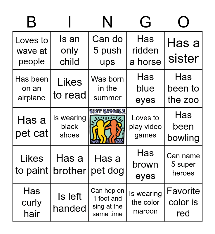 This bingo card has a free space and 24 words: Has a brother, Is left handed, Was born in the summer, Has curly hair, Has a sister, Loves to wave at people, Has been on an airplane, Is an only child, Loves to play video games, Has a pet dog, Has blue eyes, Has a pet cat, Has brown eyes, Can name 5 super heroes, Likes to read, Is wearing the color maroon, Has been bowling, Can do 5 push ups, Has been to the zoo, Is wearing black shoes, Favorite color is red, Likes to paint, Has ridden a horse and Can hop on 1 foot and sing at the same time.