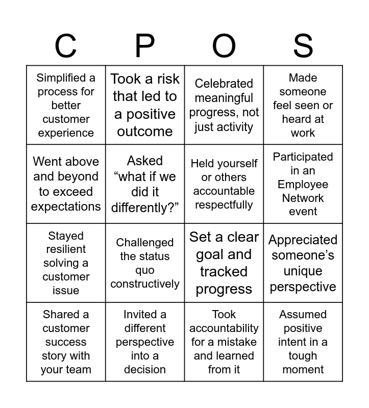 This bingo card has 28 words: Helped a customer solve a tough problem, Suggested a new way to improve a process, Took accountability for a mistake and learned from it, Volunteered in your community recently, Went above and beyond to exceed expectations, Took a risk that led to a positive outcome, Celebrated meaningful progress, not just activity, Appreciated someone’s unique perspective, Stayed resilient solving a customer issue, Invited a different perspective into a decision, Took initiative to solve a problem without being asked, Made someone feel seen or heard at work, Addressed a customer issue creatively, Learned a new skill or tool recently, Followed through on a tough commitment, Helped a colleague from another team, Received positive feedback from a customer, Asked “what if we did it differently?”, Set a clear goal and tracked progress, Assumed positive intent in a tough moment, Simplified a process for better customer experience, Attended a webinar or training session, Asked for feedback to improve, Participated in an Employee Network event, Shared a customer success story with your team, Challenged the status quo constructively, Held yourself or others accountable respectfully and Took the time to mentor or coach someone.