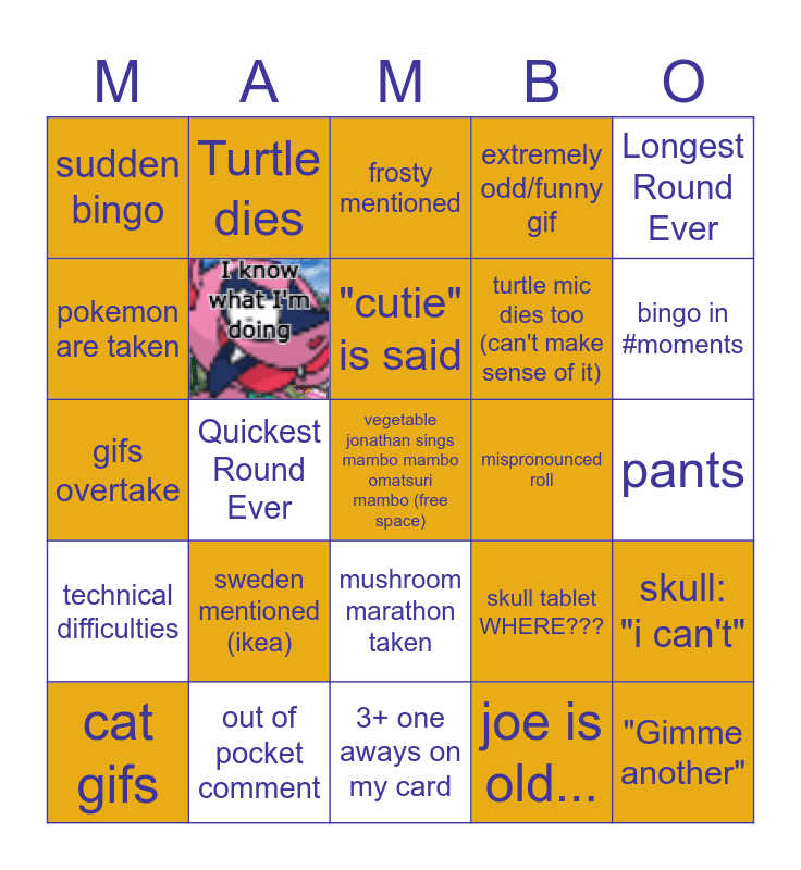 This bingo card has 1 images, a free space and 23 words: sweden mentioned (ikea), out of pocket comment, "cutie" is said, cat gifs, Longest Round Ever, sudden bingo, pokemon are taken, Turtle dies, mispronounced roll, mushroom marathon taken, turtle mic dies too (can't make sense of it), gifs overtake, skull tablet WHERE???, skull: "i can't", joe is old..., pants, frosty mentioned, bingo in #moments, Quickest Round Ever, "Gimme another", technical difficulties, extremely odd/funny gif and 3+ one aways on my card.