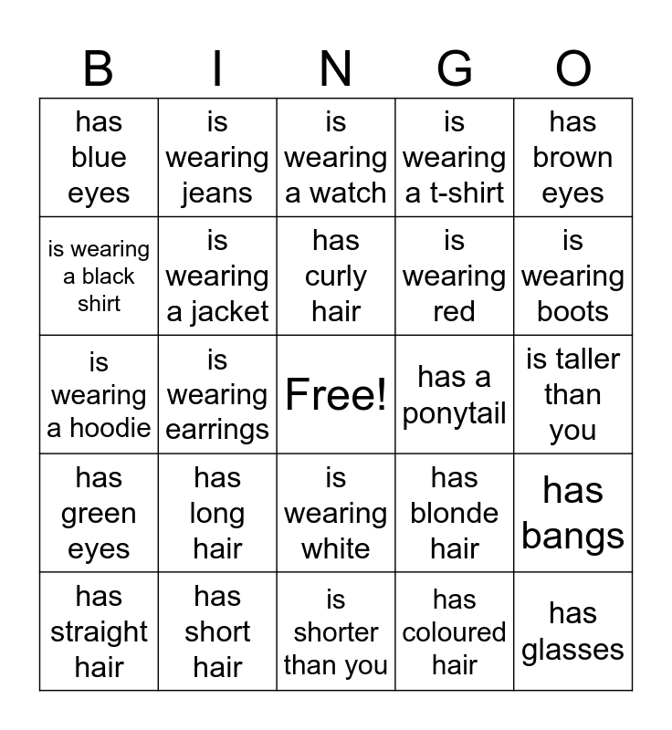 This bingo card has a free space and 24 words: has long hair, has short hair, has curly hair, has straight hair, has brown eyes, has blue eyes, is wearing a black shirt, is wearing jeans, has a ponytail, is wearing white, is wearing red, is wearing a hoodie, has blonde hair, has bangs, is wearing a jacket, has coloured hair, is taller than you, is wearing a watch, is wearing boots, is wearing earrings, has glasses, has green eyes, is wearing a t-shirt and is shorter than you.