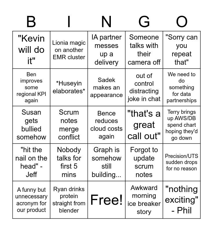 This bingo card has 25 words: "hit the nail on the head" - Jeff, Ryan drinks protein straight from blender, Bence reduces cloud costs again, Awkward morning ice breaker story, "Sorry can you repeat that", "Kevin will do it", Lionia magic on another EMR cluster, IA partner messes up a delivery, "that's a great call out", Precision/UTS sudden drops for no reason, Ben improves some regional KPI again, *Huseyin elaborates*, Free!, Forgot to update scrum notes, We need to do something for data partnerships, A funny but unnecessary acronym for our product, Scrum notes merge conflict, Sadek makes an appearance, out of control distracting joke in chat, Terry brings up AWS/DB spend chart hoping they'd go down, Susan gets bullied somehow, Nobody talks for first 5 mins, Graph is somehow still building..., Someone talks with their camera off and "nothing exciting" - Phil.