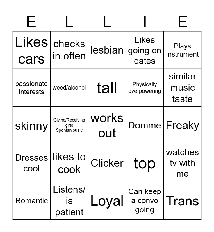 This bingo card has 25 words: likes to cook, Loyal, tall, Romantic, Plays instrument, Likes cars, passionate interests, checks in often, Domme, Clicker, Physically overpowering, skinny, top, watches tv with me, weed/alcohol, Trans, Freaky, lesbian, similar music taste, Giving/Receiving gifts Spontaniously, works out, Listens/ is patient, Dresses cool, Likes going on dates and Can keep a convo going.