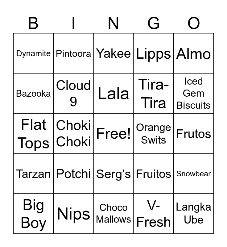 This bingo card has a free space and 40 words: Choc Nut, Flat Tops, Curly Tops, Cloud 9, Nips, Serg’s, Lala, Big Bang, Almo, Tarzan, Choki Choki, Lipps, Langka Ube, Frutos, Orange Swits, Potchi, XO, Dynamite, Judge, Yakee, Snowbear, V-Fresh, Tira-Tira, Bazooka, Choco Mucho, Tootsie Roll, Stik-O, Caramel, White Rabbit, Haw Haw, Mik-Mik, Big Boy, Peter’s Butter Ball, Fruitos, Iced Gem Biscuits, Choco Mallows, Kendi Mint, Stay Fresh, Pintoora and Ricoa Coins.