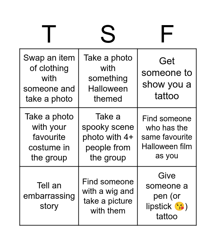This bingo card has 15 words: Take a shot or buy someone a drink, Make a secret handshake with someone, Get someone to show you a tattoo, Swap an item of clothing with someone and take a photo, Find someone with a wig and take a picture with them, Take a spooky scene photo with 4+ people from the group, Kiss someone, Take a photo with your favourite costume in the group, Find someone who has the same favourite Halloween film as you, Give someone a pen (or lipstick 😘) tattoo, Chug a PINT glass full of water, Take a photo with your favourite costume in the group, Tell an embarrassing story, Take a photo with something Halloween themed and Post a photo on your story and tag TSF.