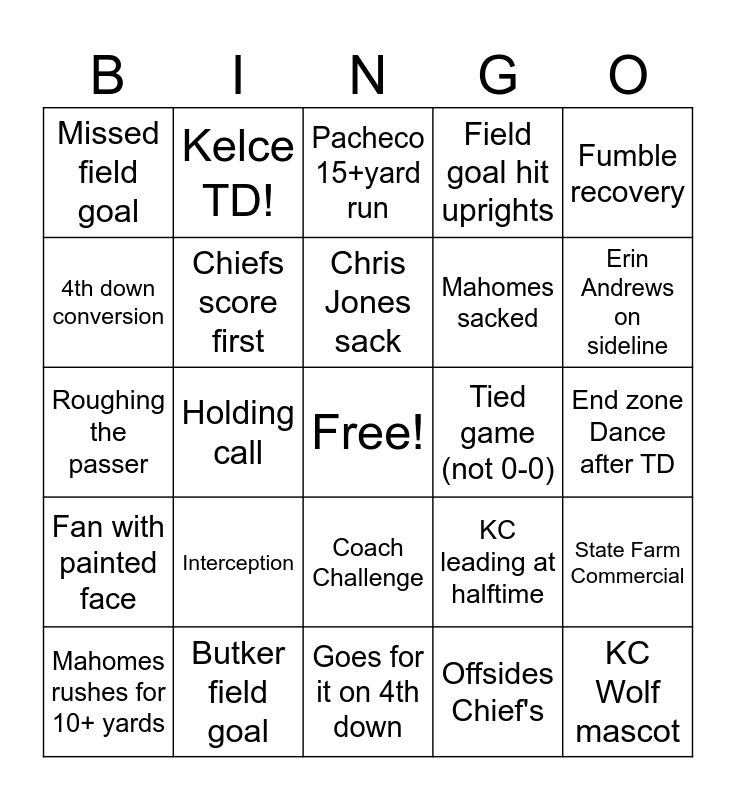 This bingo card has a free space and 24 words: Interception, Butker field goal, Chris Jones sack, Mahomes rushes for 10+ yards, Fumble recovery, Missed field goal, 4th down conversion, Kelce TD!, Tied game (not 0-0), Coach Challenge, Mahomes sacked, Roughing the passer, KC leading at halftime, State Farm Commercial, Chiefs score first, Offsides Chief's, End zone Dance after TD, Pacheco 15+yard run, Erin Andrews on sideline, Holding call, KC Wolf mascot, Fan with painted face, Field goal hit uprights and Goes for it on 4th down.