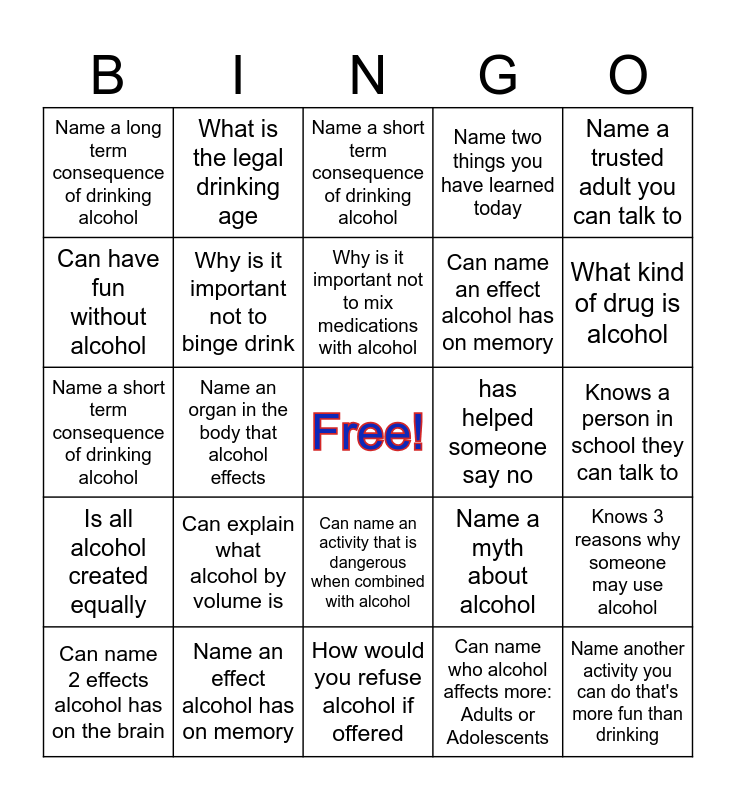 This bingo card has a free space and 24 words: Can name 2 effects alcohol has on the brain, Can explain what alcohol by volume is, Why is it important not to mix medications with alcohol, Can name who alcohol affects more: Adults or Adolescents, Name a trusted adult you can talk to, Name a long term consequence of drinking alcohol, What is the legal drinking age, Name a short term consequence of drinking alcohol, has helped someone say no, Knows a person in school they can talk to, Name a short term consequence of drinking alcohol, Why is it important not to binge drink, Name a myth about alcohol, Knows 3 reasons why someone may use alcohol, Can have fun without alcohol, Name an effect alcohol has on memory, How would you refuse alcohol if offered, Name two things you have learned today, What kind of drug is alcohol, Is all alcohol created equally, Name an organ in the body that alcohol effects, Can name an activity that is dangerous when combined with alcohol, Can name an effect alcohol has on memory and Name another activity you can do that's more fun than drinking.