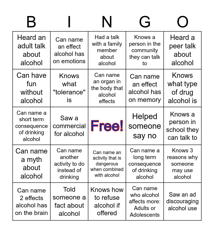 This bingo card has a free space and 24 words: Can name 2 effects alcohol has on the brain, Can name another activity to do instead of drinking, Can name an organ in the body that alcohol effects, Can name who alcohol affects more: Adults or Adolescents, Heard a peer talk about alcohol, Heard an adult talk about alcohol, Can name an effect alcohol has on emotions, Had a talk with a family member about alcohol, Helped someone say no, Knows a person in school they can talk to, Can name a short term consequence of drinking alcohol, Knows what "tolerance" is, Can name a long term consequence of drinking alcohol, Knows 3 reasons why someone may use alcohol, Can have fun without alcohol, Told someone a fact about alcohol, Knows how to refuse alcohol if offered, Knows a person in the community they can talk to, Knows what type of drug alcohol is, Can name a myth about alcohol, Saw a commercial for alcohol, Can name an activity that is dangerous when combined with alcohol, Can name an effect alcohol has on memory and Saw an ad discouraging alcohol use.
