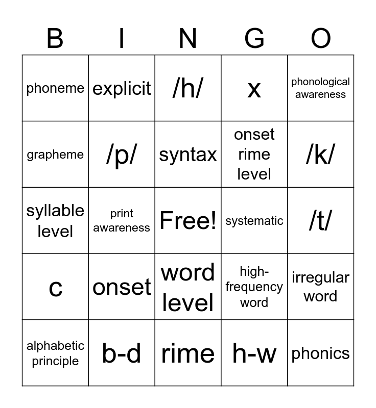 This bingo card has a free space and 25 words: onset, rime, syntax, alphabetic principle, phonological awareness, phoneme, grapheme, explicit, systematic, word level, onset rime level, syllable level, high-frequency word, irregular word, /p/, /m/, /t/, /h/, /k/, print awareness, phonics, b-d, c, x and h-w.