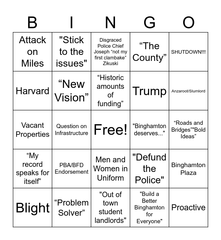 This bingo card has a free space and 40 words: Code Enforcement, Vacant Properties, Public Safety, “New Vision”, “Problem Solver”, Men and Women in Uniform, “Historic amounts of funding”, Blame federal government, SHUTDOWN!!!, “My record speaks for itself”, Question on Infrastructure, “The County”, Proactive, “Roads and Bridges”"Bold Ideas”, "Binghamton deserves...", PBA/BFD Endorsement, Blue Bags, Attack on Miles, "My plan", Disgraced Police Chief Joseph “not my first clambake” Zikuski, Binghamton Plaza, "Build a Better Binghamton for Everyone", Trump, Harvard, DRI, "There's nothing to do in Binghamton", "Mayor's cannot be managers they need to fighters and protectors", Lincoln the Dog, Homeowners, Jared Sides with Landlords, "Tackle the Housing Crisis", Blight, "Democrat Party", "Defund the Police", Anzaroot/Slumlord, "Out of town student landlords", Good Cause, Exposes Jared's Poor Record, "Stick to the issues" and LBJ Quote.