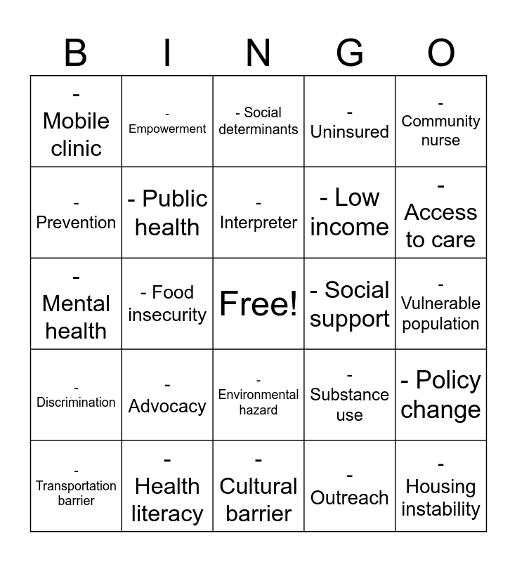 This bingo card has a free space and 25 words: - Advocacy, - Cultural barrier, - Interpreter, - Transportation barrier, - Community nurse, - Mobile clinic, - Prevention, - Empowerment, - Social support, - Environmental hazard, - Low income, - Mental health, - Substance use, - Policy change, - Public health, - Health equity, - Vulnerable population, - Social determinants, - Access to care, - Food insecurity, - Housing instability, - Health literacy, - Discrimination, - Uninsured and - Outreach.