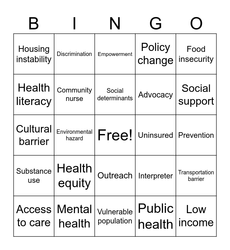 This bingo card has a free space and 25 words: Health equity, Vulnerable population, Social determinants, Access to care, Food insecurity, Housing instability, Health literacy, Discrimination, Uninsured, Outreach, Advocacy, Cultural barrier, Interpreter, Transportation barrier, Community nurse, Mobile clinic, Prevention, Empowerment, Social support, Environmental hazard, Low income, Mental health, Substance use, Policy change and Public health.