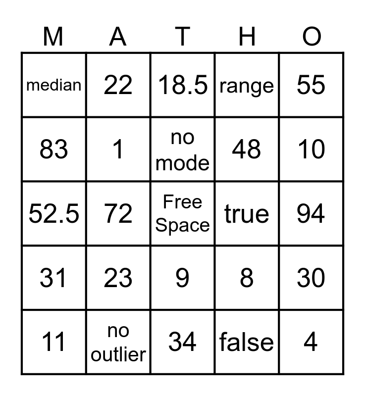 This bingo card has a free space and 39 words: mean, 16, 6.5, 1, 11, 9, no mode, 7, 8, 55, 31, 72, range, 4, 94, true, 23, 13, median, 2, 8, 83, 34, 48, 10, 7, 63, mode, outlier, 6, 22, 6, 10, 36.5, 18.5, no outlier, false, 49.25, 30, 52.5 and 29.