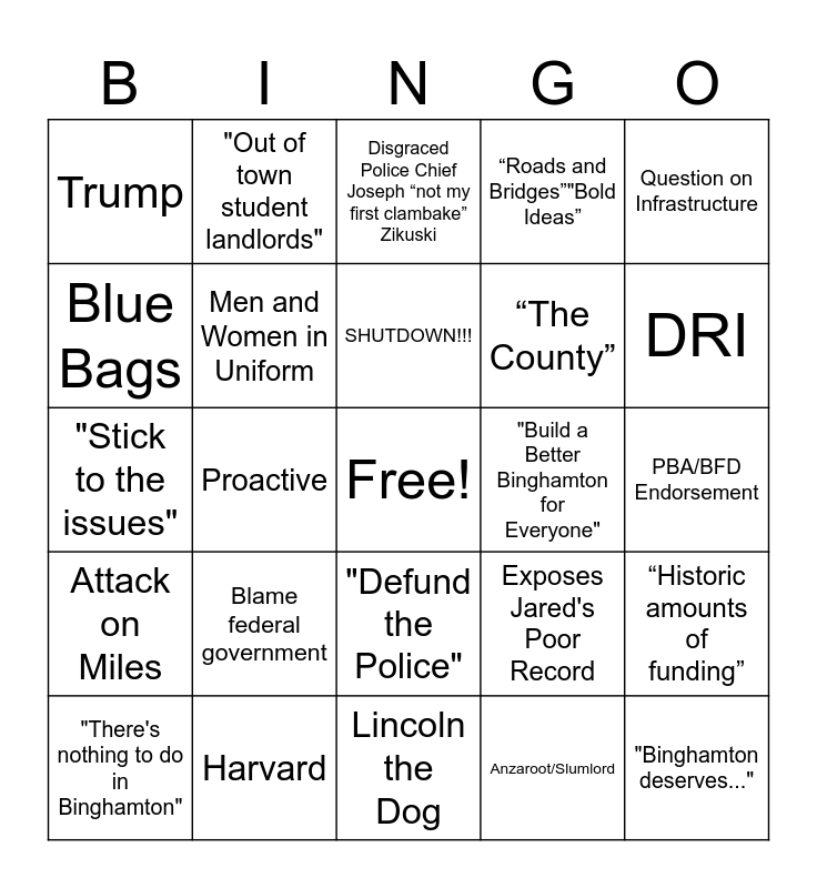 This bingo card has a free space and 38 words: Public Safety, “New Vision”, “Problem Solver”, Men and Women in Uniform, “Historic amounts of funding”, Blame federal government, SHUTDOWN!!!, “My record speaks for itself”, Question on Infrastructure, “The County”, Proactive, “Roads and Bridges”"Bold Ideas”, "Binghamton deserves...", PBA/BFD Endorsement, Blue Bags, Attack on Miles, "My plan", Disgraced Police Chief Joseph “not my first clambake” Zikuski, Binghamton Plaza, "Build a Better Binghamton for Everyone", Trump, Harvard, DRI, "There's nothing to do in Binghamton", "Mayor's cannot be managers they need to fighters and protectors", Lincoln the Dog, Homeowners, Jared Sides with Landlords, "Tackle the Housing Crisis", Blight, "Democrat Party", "Defund the Police", Anzaroot/Slumlord, "Out of town student landlords", Good Cause, Exposes Jared's Poor Record, "Stick to the issues" and LBJ Quote.