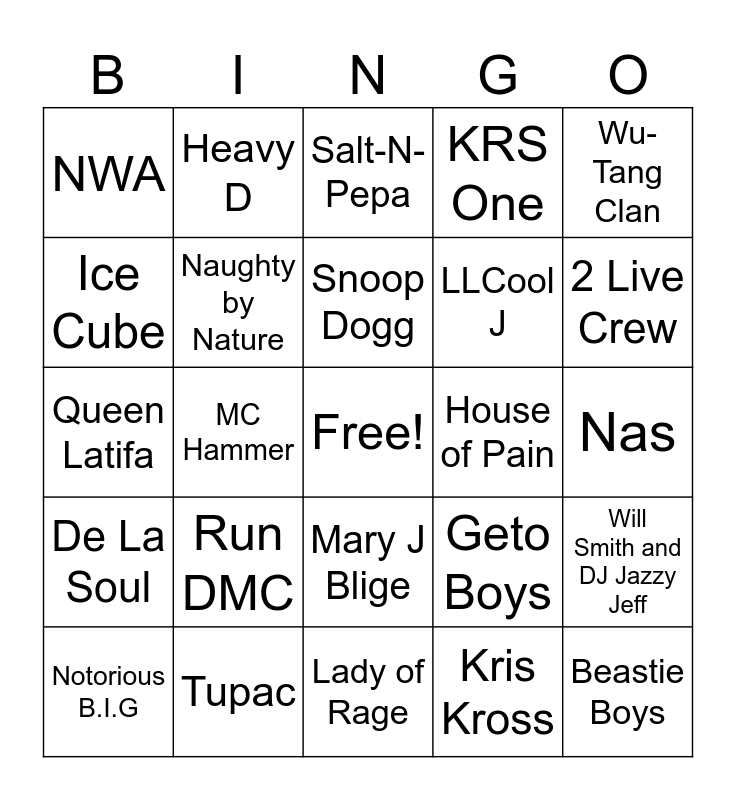 This bingo card has a free space and 24 words: Run DMC, Tupac, Snoop Dogg, Notorious B.I.G, Wu-Tang Clan, NWA, Ice Cube, Heavy D, House of Pain, Mary J Blige, LLCool J, Queen Latifa, Geto Boys, Will Smith and DJ Jazzy Jeff, Naughty by Nature, Kris Kross, Nas, Salt-N-Pepa, 2 Live Crew, MC Hammer, Beastie Boys, De La Soul, KRS One and Lady of Rage.