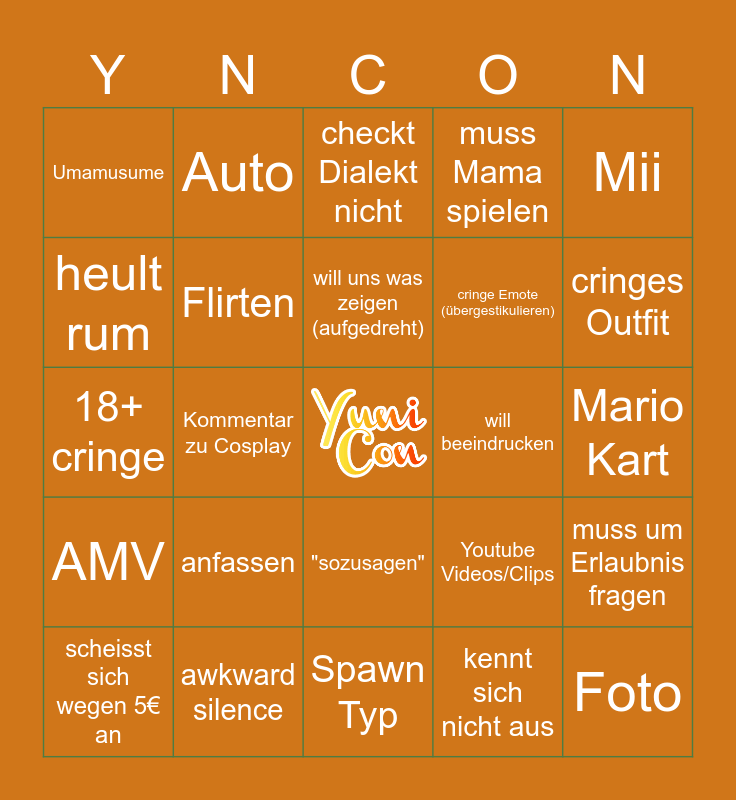 This bingo card has a free space and 24 words: scheisst sich wegen 5€ an, anfassen, will uns was zeigen (aufgedreht), kennt sich nicht aus, Mii, Umamusume, Auto, checkt Dialekt nicht, will beeindrucken, Mario Kart, 18+ cringe, Flirten, Youtube Videos/Clips, muss um Erlaubnis fragen, heult rum, awkward silence, Spawn Typ, muss Mama spielen, cringes Outfit, AMV, Kommentar zu Cosplay, "sozusagen", cringe Emote (übergestikulieren) and Foto.