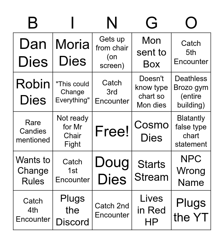 This bingo card has a free space and 25 words: Catch 1st Encounter, Catch 2nd Encounter, Catch 3rd Encounter, Catch 4th Encounter, Catch 5th Encounter, Dan Dies, Robin Dies, Moria Dies, Cosmo Dies, Doug Dies, Doesn't know type chart so Mon dies, Rare Candies mentioned, Starts Stream, NPC Wrong Name, "This could Change Everything", Pokemon Sacrificed with no remorse, Blatantly false type chart statement, Gets up from chair (on screen), Deathless Brozo gym (entire building), Not ready for Mr Chair Fight, Plugs the YT, Plugs the Discord, Wants to Change Rules, Mon sent to Box and Lives in Red HP.