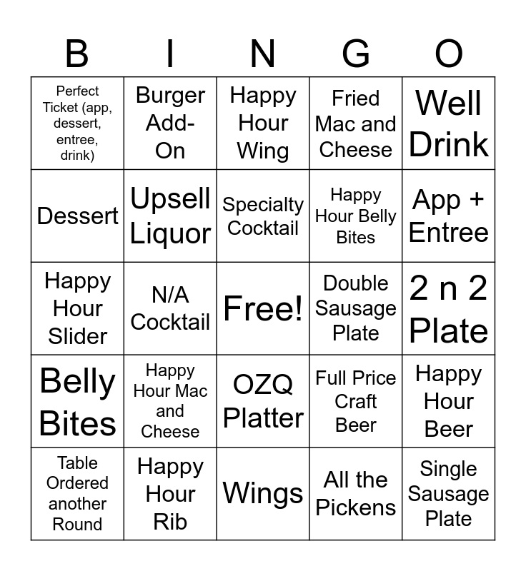 This bingo card has a free space and 24 words: Happy Hour Mac and Cheese, Happy Hour Rib, Specialty Cocktail, Table Ordered another Round, Well Drink, Perfect Ticket (app, dessert, entree, drink), Dessert, Burger Add-On, Double Sausage Plate, OZQ Platter, Happy Hour Belly Bites, Happy Hour Slider, Full Price Craft Beer, Happy Hour Beer, Upsell Liquor, All the Pickens, 2 n 2 Plate, Happy Hour Wing, App + Entree, N/A Cocktail, Single Sausage Plate, Belly Bites, Fried Mac and Cheese and Wings.