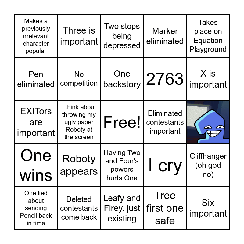 This bingo card has 1 images, a free space and 23 words: Roboty appears, Deleted contestants come back, One backstory, One lied about sending Pencil back in time, Takes place on Equation Playground, Makes a previously irrelevant character popular, Pen eliminated, Three is important, Eliminated contestants important, Having Two and Four's powers hurts One, 2763, EXITors are important, I cry, Cliffhanger (oh god no), No competition, Tree first one safe, Two stops being depressed, X is important, I think about throwing my ugly paper Roboty at the screen, Six important, One wins, Marker eliminated and Leafy and Firey. just existing.