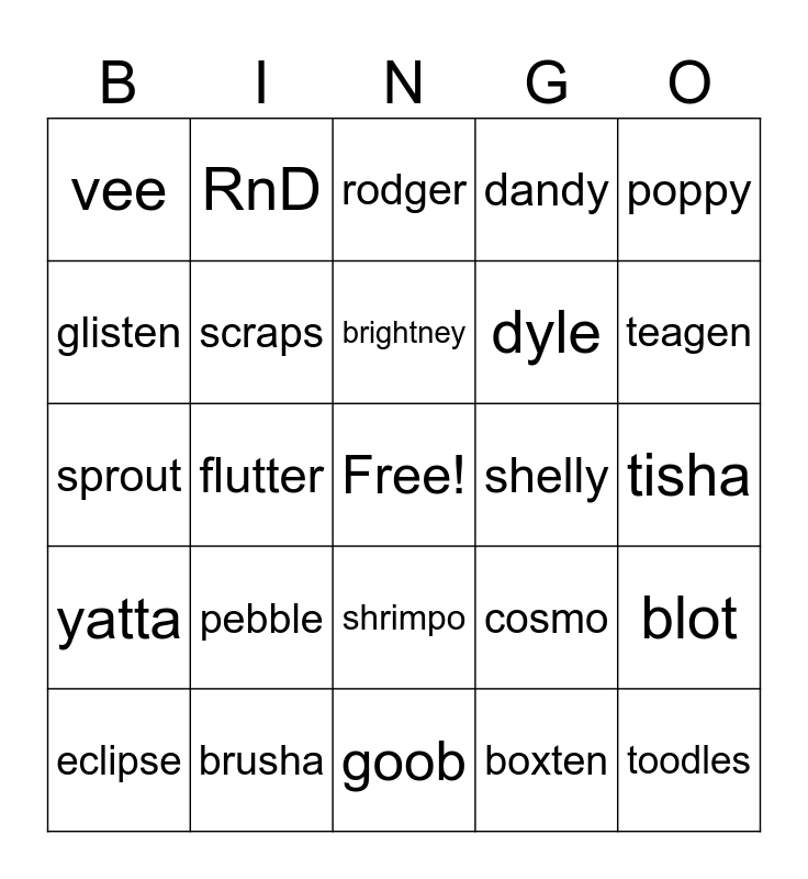 This bingo card has a free space and 24 words: pebble, brusha, brightney, eclipse, poppy, vee, glisten, RnD, shelly, shrimpo, dyle, sprout, cosmo, blot, scraps, boxten, tisha, rodger, teagen, flutter, toodles, yatta, dandy and goob.