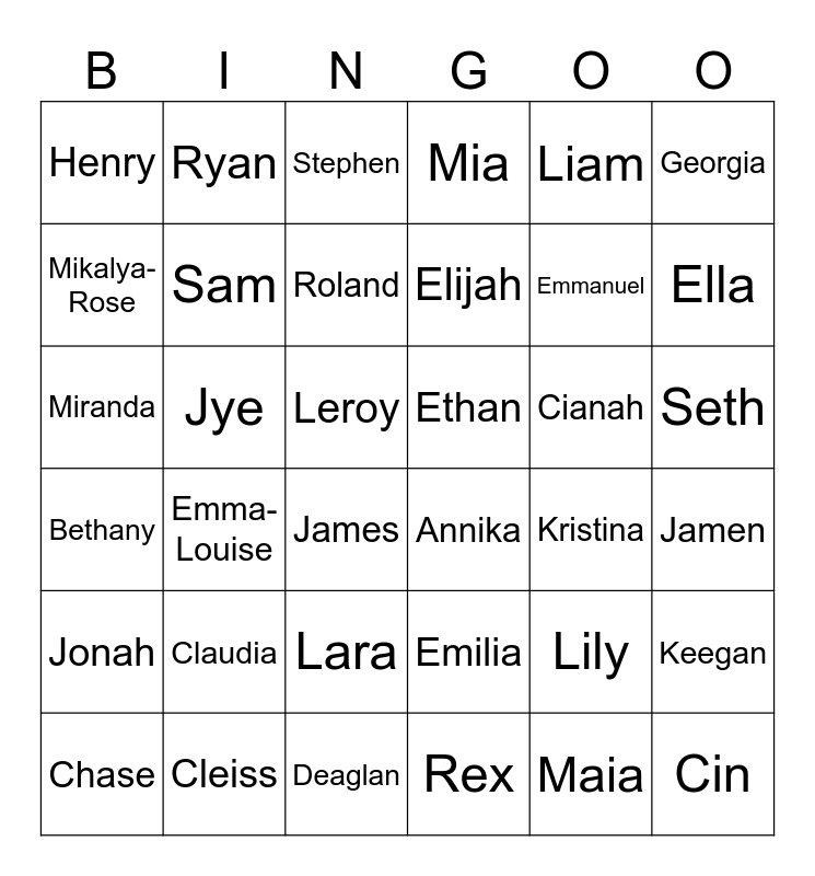 This bingo card has 36 words: Emilia, Lara, Rex, Mikalya-Rose, Bethany, Ethan, Sam, Deaglan, Liam, Lily, Ella, Mia, Keegan, Jye, Elijah, Henry, Jonah, Cianah, Miranda, Stephen, Leroy, Emma-Louise, Annika, James, Kristina, Ryan, Emmanuel, Cleiss, Roland, Georgia, Cin, Chase, Jamen, Seth, Claudia and Maia.