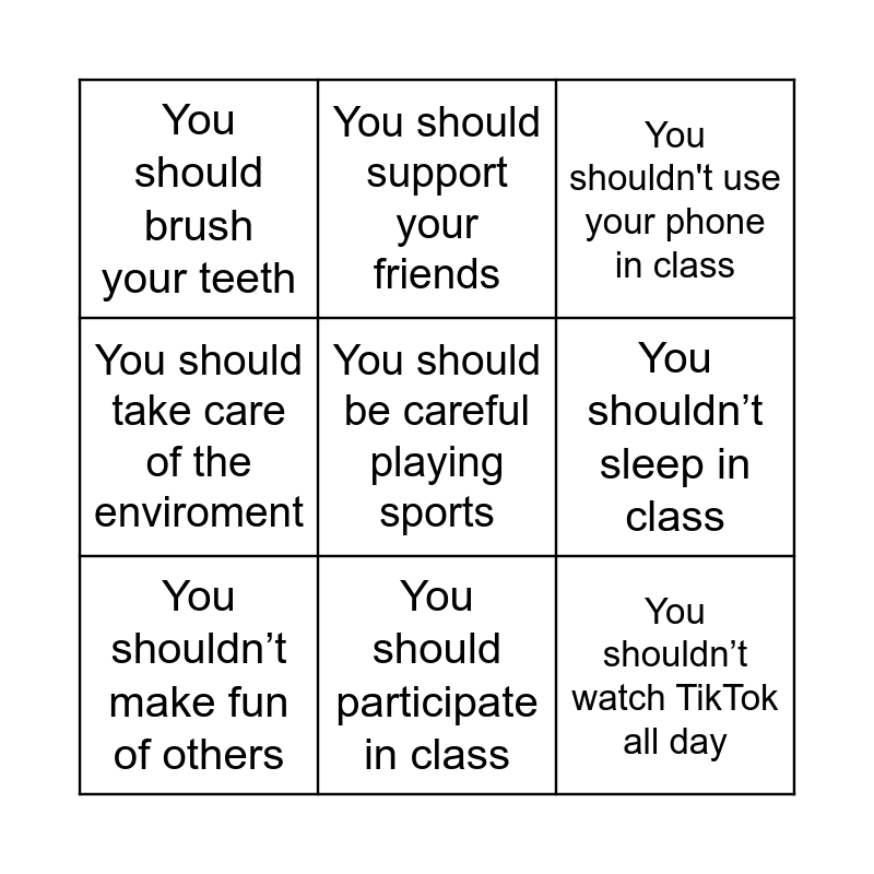This bingo card has 13 words: Free!, You should drink water everyday, You shouldn’t make fun of others, You should support your friends, You should take care of the enviroment, You should be careful playing sports, You shouldn’t watch TikTok all day, You shouldn’t cheat in exams, You should participate in class, You should brush your teeth, You shouldn’t sleep in class, You shouldn't use your phone in class and You should take care of animals.