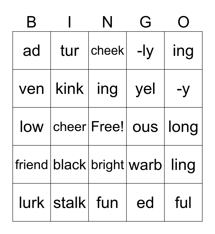 This bingo card has a free space and 24 words: black, stalk, ing, lurk, ing, ad, ven, tur, ous, bright, yel, low, warb, ling, kink, ed, long, cheek, -y, cheer, ful, friend, -ly and fun.