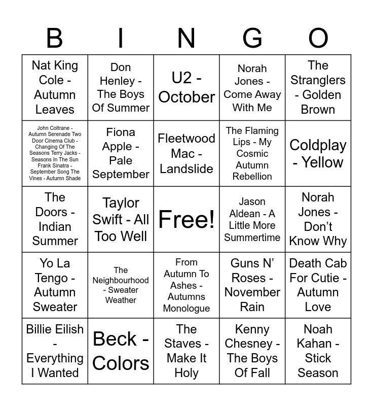 This bingo card has a free space and 66 words: Earth, Wind, And Fire - September, Green Day - Wake Me Up When September Ends, Neil Young - Harvest Moon, Kenny Chesney - The Boys Of Fall, Death Cab For Cutie - Autumn Love, Fall Out Boy - Grand Theft Autumn/Where Is Your Boy, Don Henley - The Boys Of Summer, Billy Talent - Fallen Leaves, Jason Aldean - A Little More Summertime, Ella Fitzgerald, Louis Armstrong - Autumn In New York, Yo La Tengo - Autumn Sweater, The White Stripes - We’re Going To Be Friends, Ed Sheeran - Autumn Leaves, The Flaming Lips - My Cosmic Autumn Rebellion, The White Stripes - Dead Leaves And The Dirty Ground, Nat King Cole - Autumn Leaves, Taylor Swift - All Too Well, U2 - October, Justin Hayward - Forever Autumn, The Stranglers - Golden Brown, The Doors - Indian Summer, The Neighbourhood - Sweater Weather, Fleetwood Mac - Landslide, James Taylor - September Grass, Bon Iver - Holocene, Lana Del Rey - RIde, Adele - Someone Like You, James Taylor - October Road, Guns N’ Roses - November Rain, KT Tunstall - Suddenly I See, Billie Eilish - Everything I Wanted, Counting Crows - A Long December, Vance Joy - Georgia, Maggie Rogers - Alaska, Coldplay - Yellow, The Cure - Pictures Of You, Imogen Heap - Hide And Seek, The Staves - Make It Holy, Sufjan Stevens - Chicago The Edgar Winter Group - Autumn, Luke Bryan - Harvest Time, John Coltrane - Autumn Serenade Two Door Cinema Club - Changing Of The Seasons Terry Jacks - Seasons In The Sun Frank Sinatra - September Song The Vines - Autumn Shade, Beck - Colors, From Autumn To Ashes - Autumns Monologue, Van Morisson - Moondance, Manic Street Preachers - Autumnsong, Britney Spears - Autumn Goodbye, Fiona Apple - Pale September, Ben Rector - Autumn, The Smashing Pumpkins - Autumn Nocturne, Noah Kahan - Stick Season, Zach Bryan - Pink Skies, Taylor Swift - Willow, Zach Bryan, Kacey Musgraves - I Remember Everything, Phoebe Bridgers - Motion Sickness, Justin Bieber - Ghost, Taylor Swift - cardigan, Lord Huron - Meet Me In The Woods, Carole King - Where You Will Lead I Will Follow, Norah Jones - Come Away With Me, Norah Jones - Don’t Know Why, Kacey Musgraves - Golden Hour, John Mayer - Stop This Train, Bon Iver, St. Vincent - Roslyn, Fleetwood Mac - Little Lies, Iron & Wine - Autumn Town Leaves and Donna Summer - Autumn Changes.
